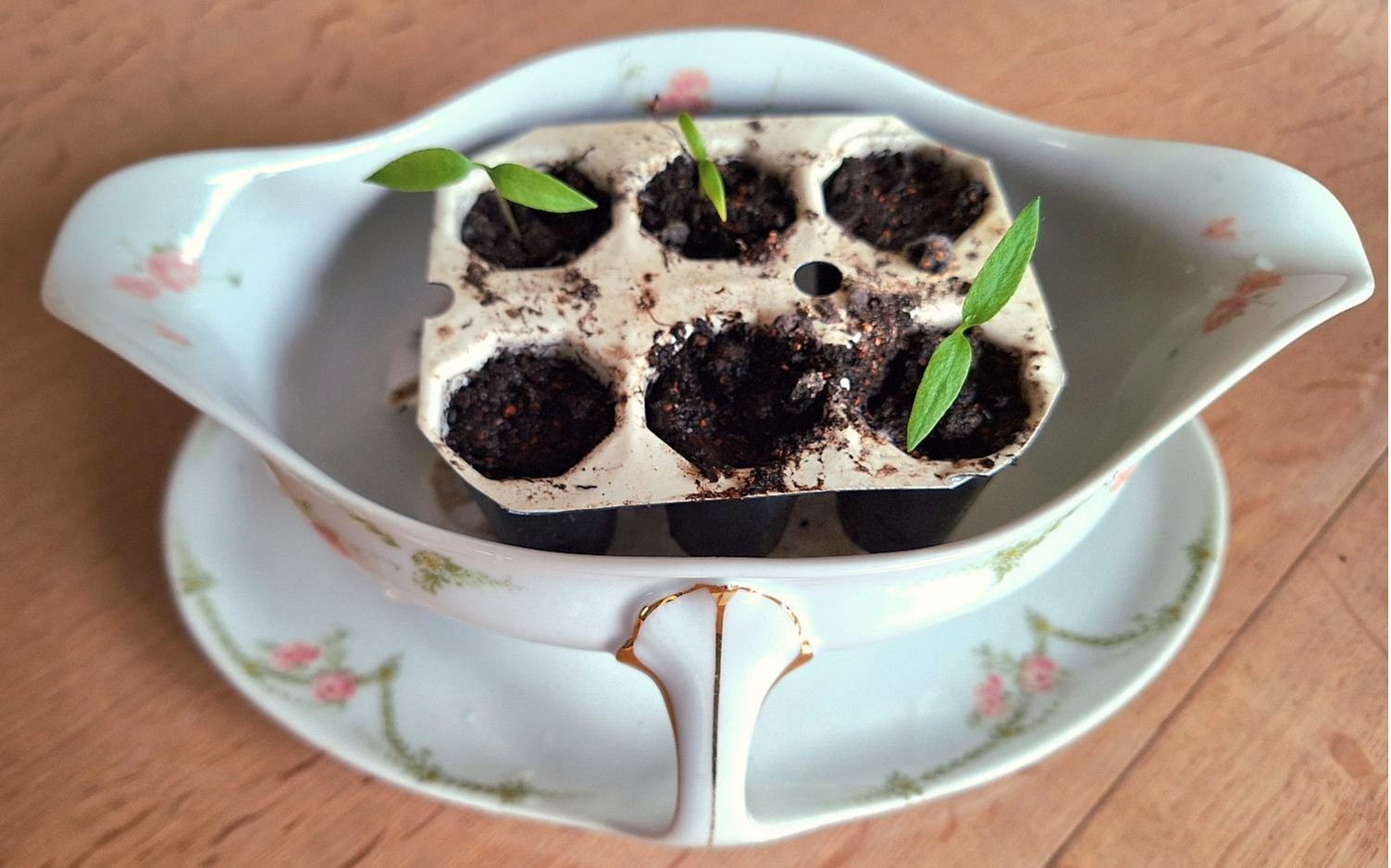 Sådan bliver det altså ikke. Nu står de tre bittesmå spirer i den smukke sovseskål fra min Moster Anna.