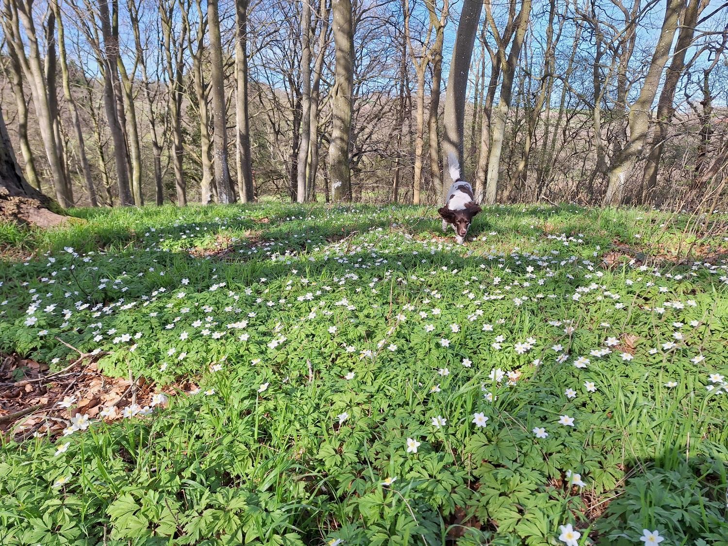 Kigger man op, ser man lige ind i mirabelletræernes blomstervæld. Der er virkelig ‘hvidt forneden, hvidt foroven’. I skovbunden og på skrænten blomstrer anemonerne. Langsomt begynder de første blade at folde sig ud på buskene, og den store kastanjes knopper vokser dag for dag.