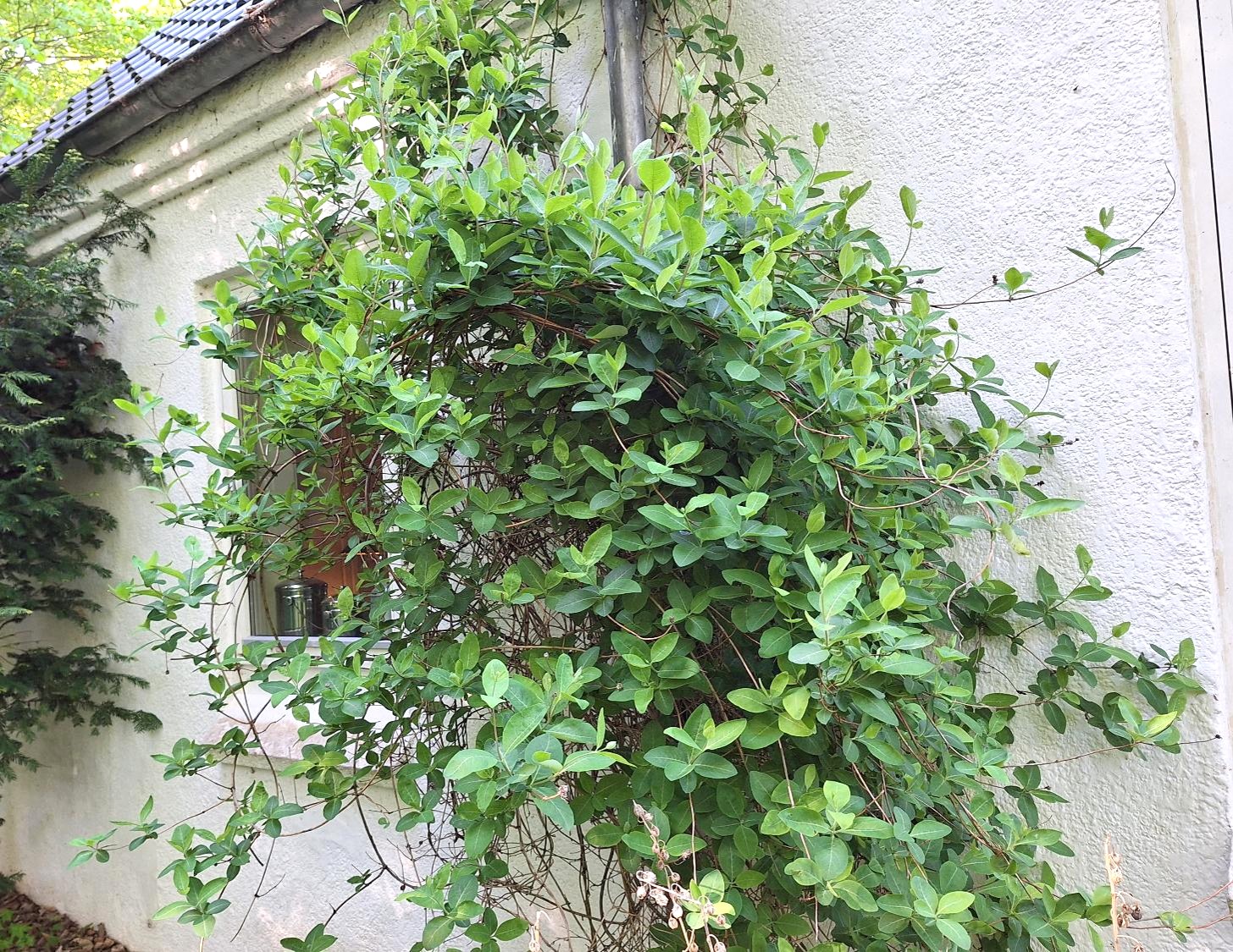 Halemejserne i kaprifolien, der i øvrigt er tæt, tyk og grøn nu og helt gemmer den lille, kugleformede rede,