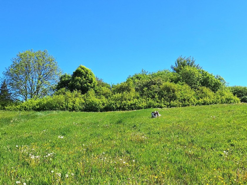 I vores græsmark er der meget rødsvingel, og de brunlilla aks bølger også for vinden – eller når der løber en hund eller tre igennem. Det giver et nyt farvespil.
