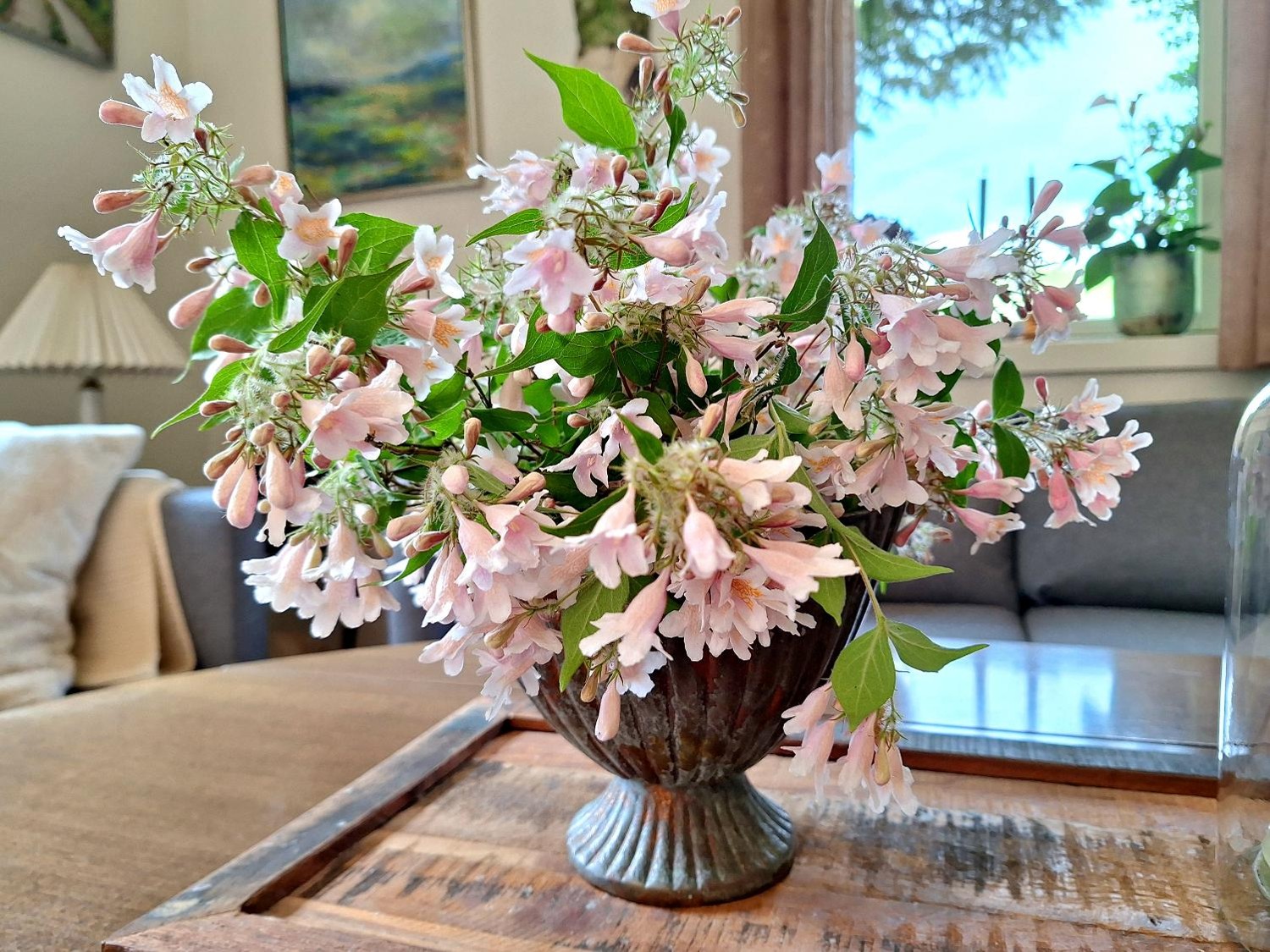 Dronningebusken er virkelig en dronning at se til. Høj og langbenet, som rigtige dronninger er, og med et brus af lyserøde blomster. Den er 20 år gammel, og den er nok fire meter høj nu og næsten lige så bred.