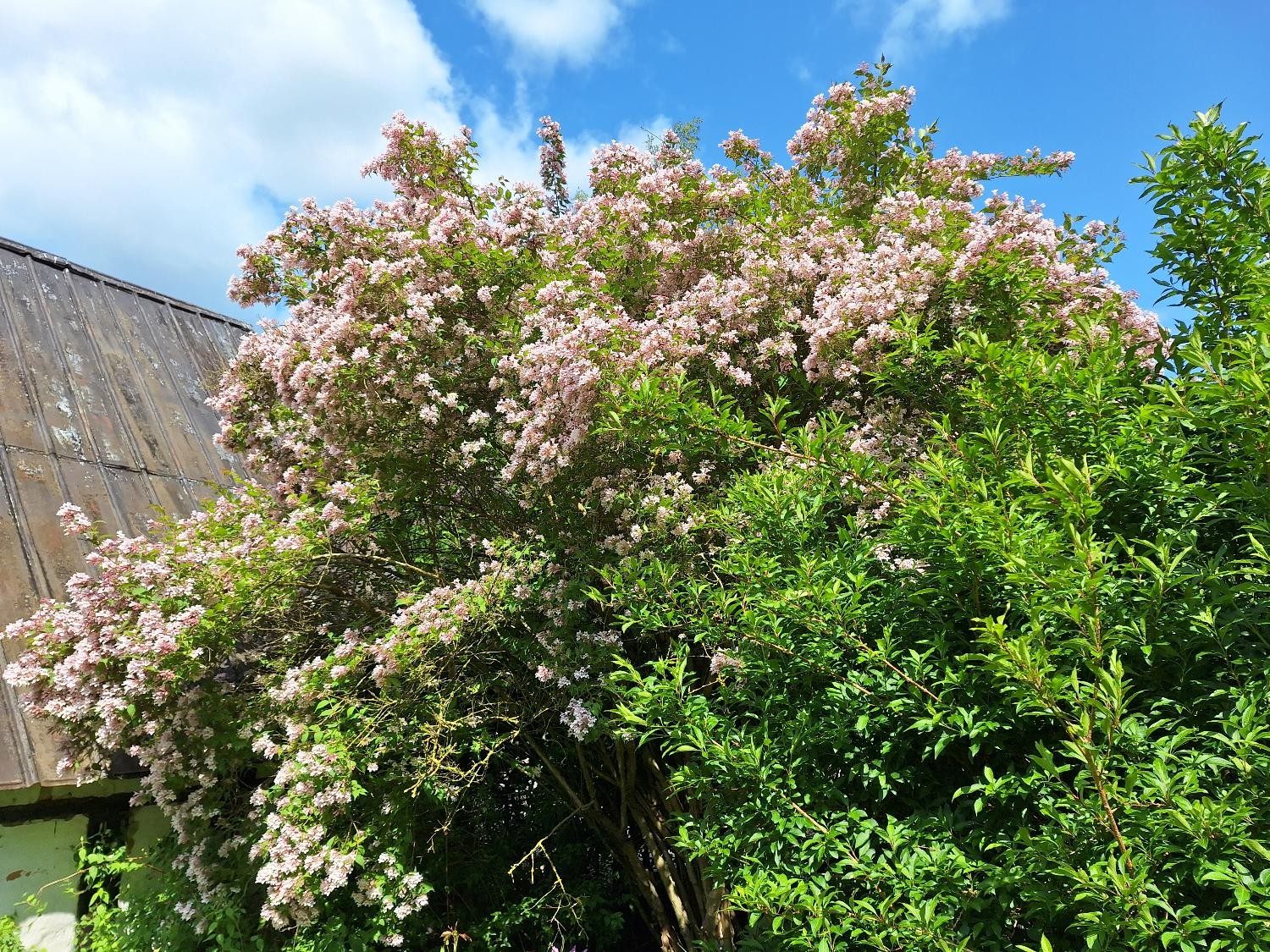 Der er nogle buske, jeg bare synes hører til i en have og især i en have på landet. Dronningebusken er en af dem, og jeg så glad for, at vores dronningebusk er helt enig. Den hører til, og lige nu blænder den undersåtterne med sin skønhed og charme.