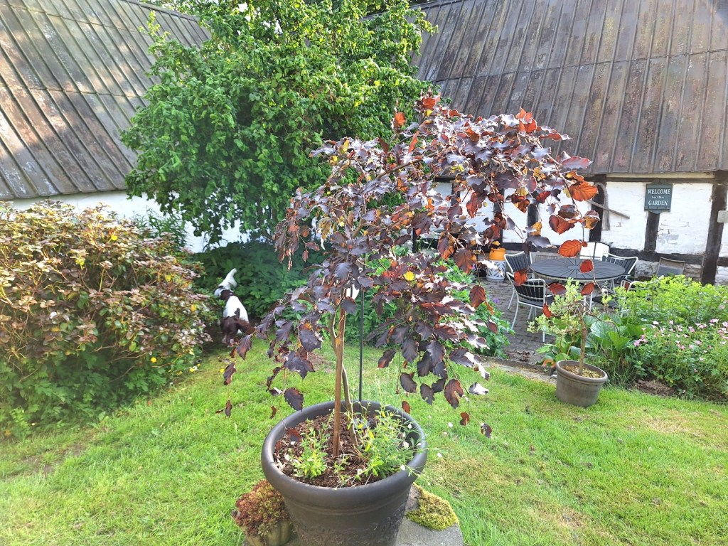 For et par år siden fik jeg tre små, selvsåede blodbøge-børn. De stammede fra bog fra et kæmpe træ, der siden er fældet. De små træer blev sat i krukker, og nu – nogle år efter – er de så store, at de kan pynte i haven.