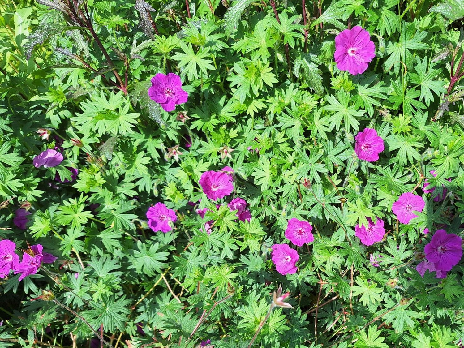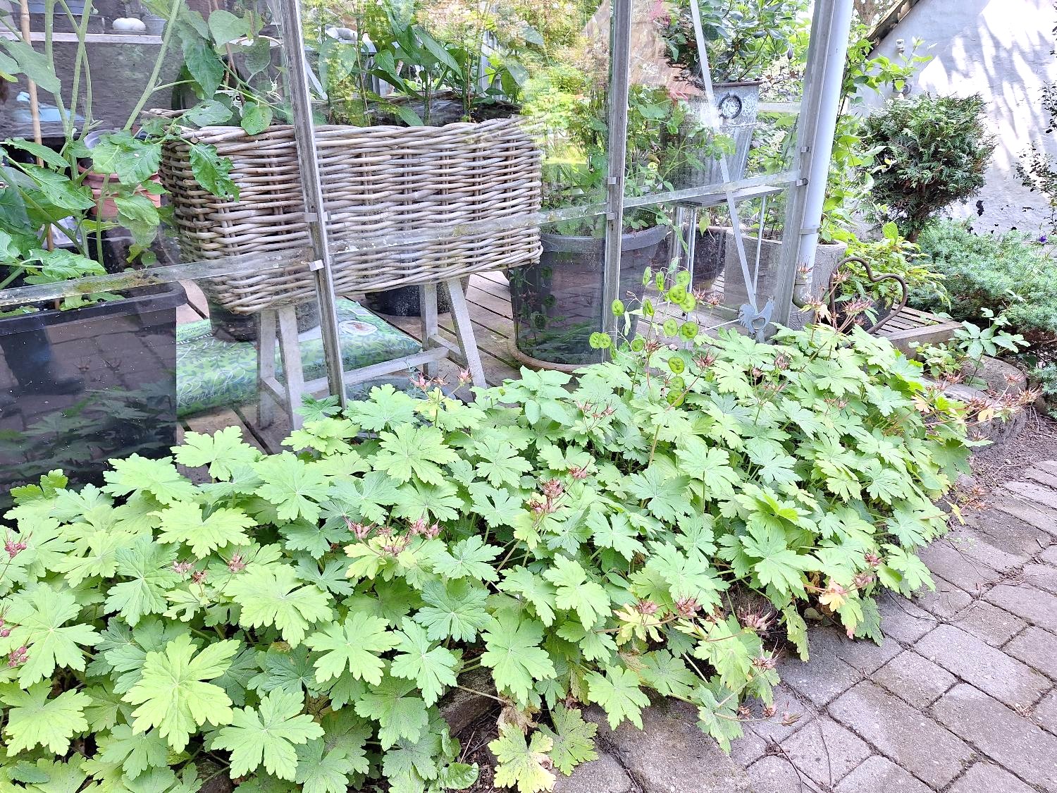 Det samme skal de smukke, storrodede storkenæb, der allerede har vist sig nyttige langs drivhuset og rundt omkring i haven.