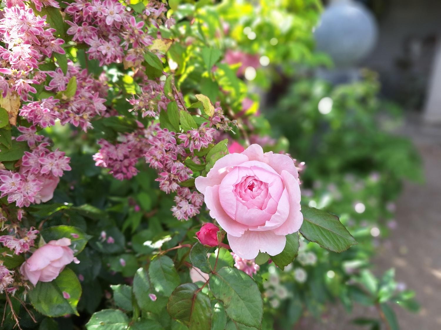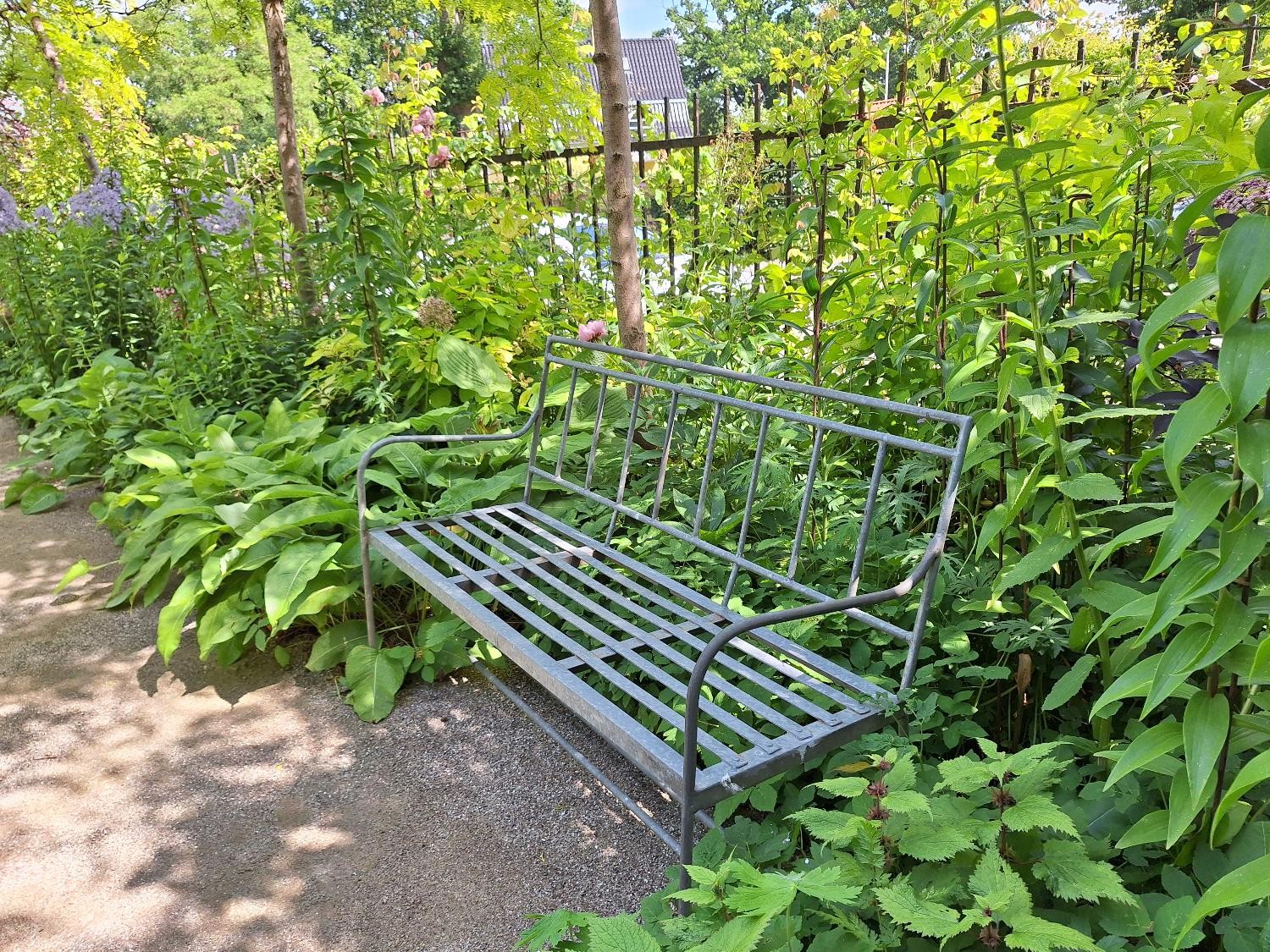 For haven er ikke bare imponerende, smuk, varieret og så videre. Nej, den er også hyggelig med alle de små kroge og hjørner med siddepladser, krukker og opstillinger.
