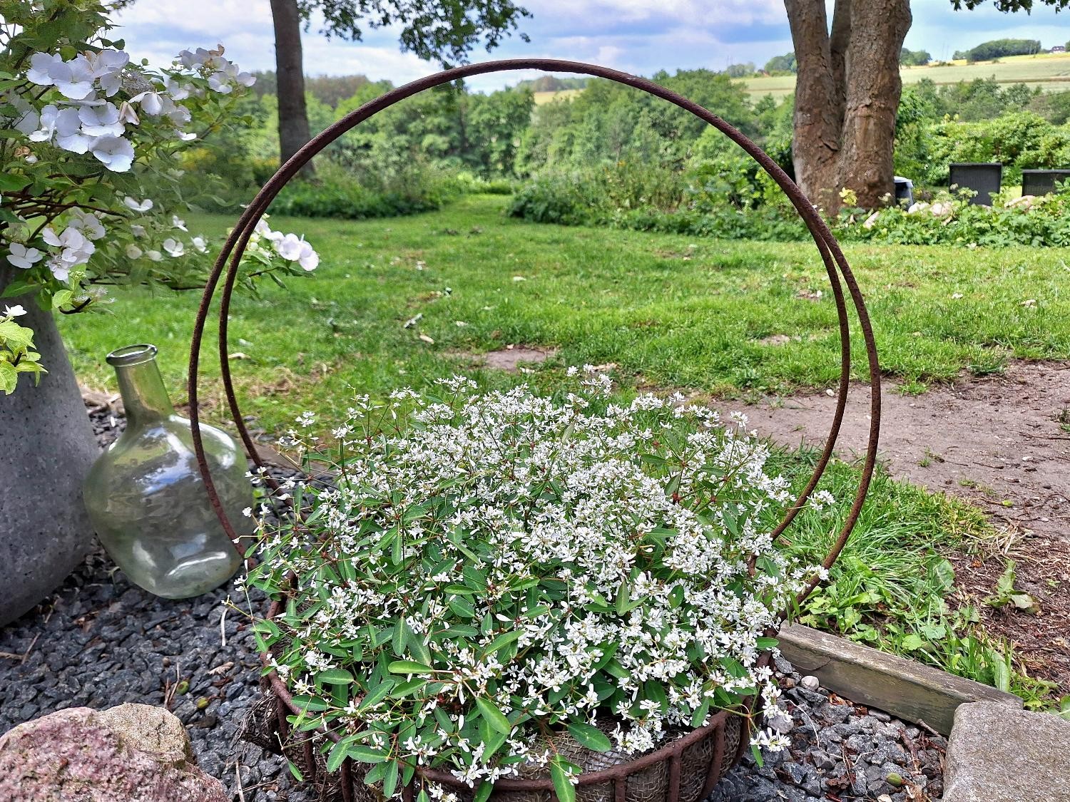 Ved siden af hende står den store jernkurv, også med hvide blomster, de holdbare og fine euphorbia Diamond Frost.