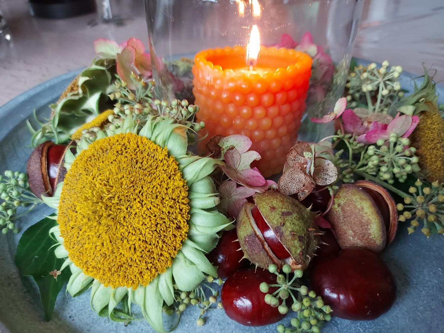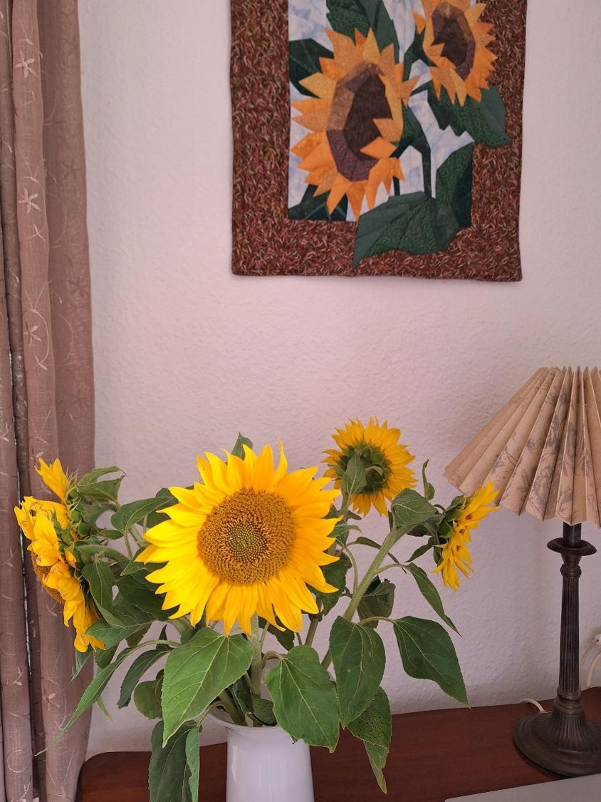 Jeg har en tur, jeg ofte går, hvor jeg kommer forbi sådan en blomsterbrakmark, og den har forsynet vaserne med mellemrum hen over sommeren. Lige nu står der solsikker i mit gyldne hjørne i stuen,