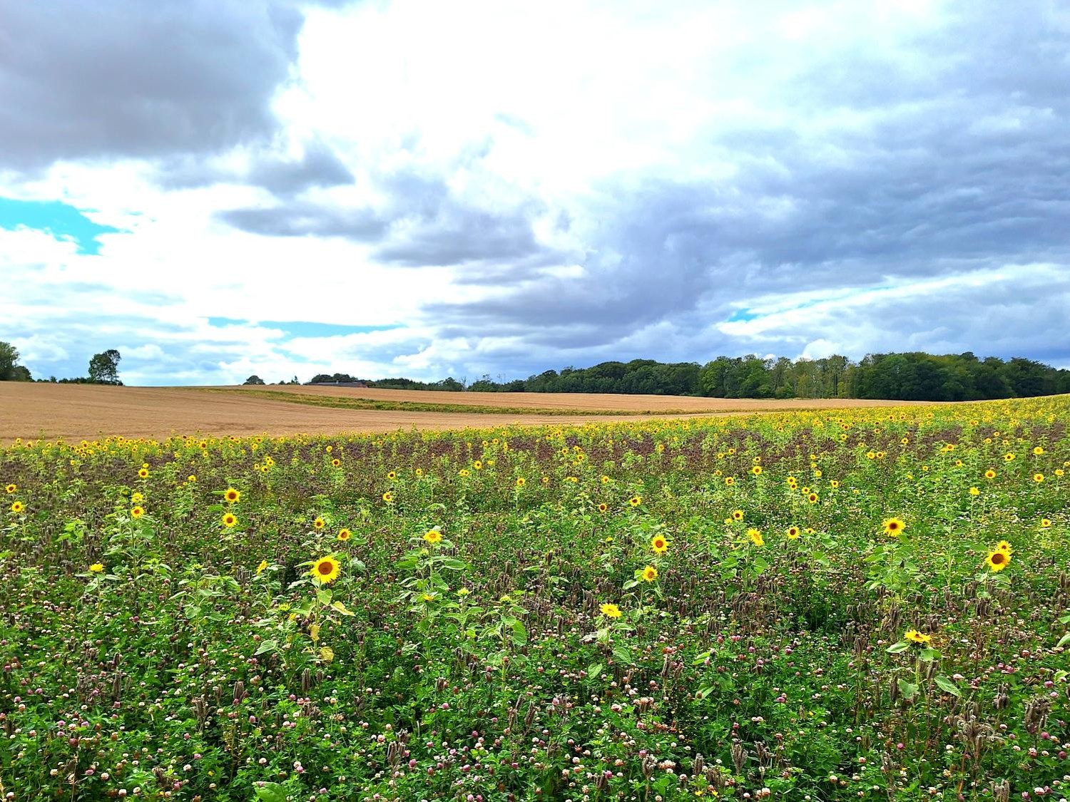 Alle de mange blomstrende blomsterbrakmarker er nu kommet til solsikkestadiet. Solsikker i tusindvis har afløst de blomstrende honningurt, boghveden og kornblomsterne. Der er mad til fuglene, til bierne og lidt til vaserne kan der også blive.