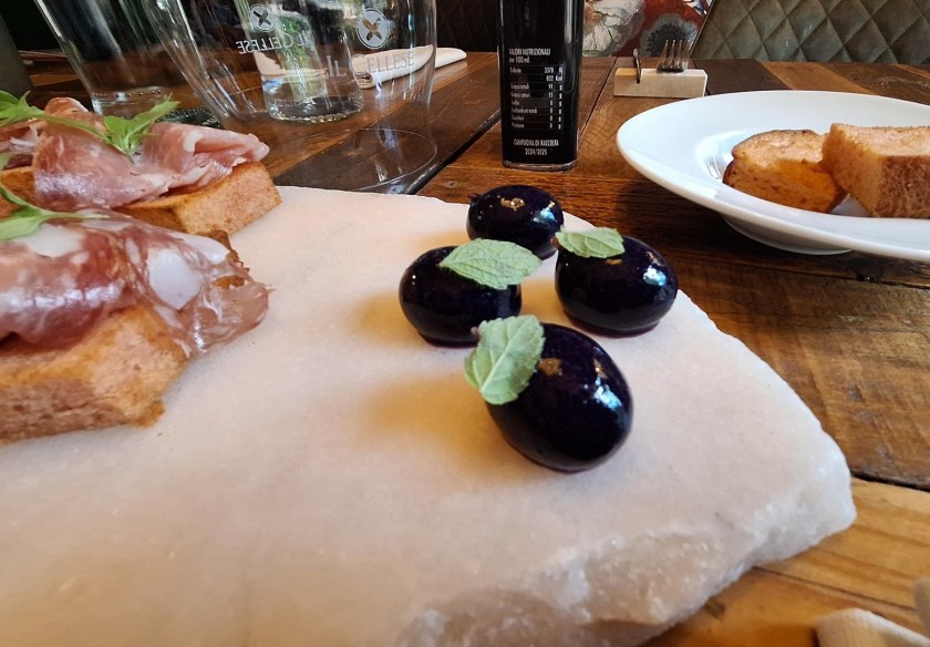 Vi fik en rundvisning og en vinsmagning, og kokkene havde lavet de lækreste, små hapsere til. De små ‘oliven’ på billedet er faktisk ikke oliven. Det er en ret med aubergine, hvor retten er frosset ned som små kugler og så dyppet i rødbedegele. Geleen stivner, når den møder den frosne kugle. Smukt og meget anderledes.