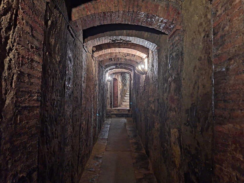 Vi fik også en rundvisning i kældrene, der under 2. verdenskrig blev brugt som beskyttelsesrum. Her mærkede man virkelig historien.