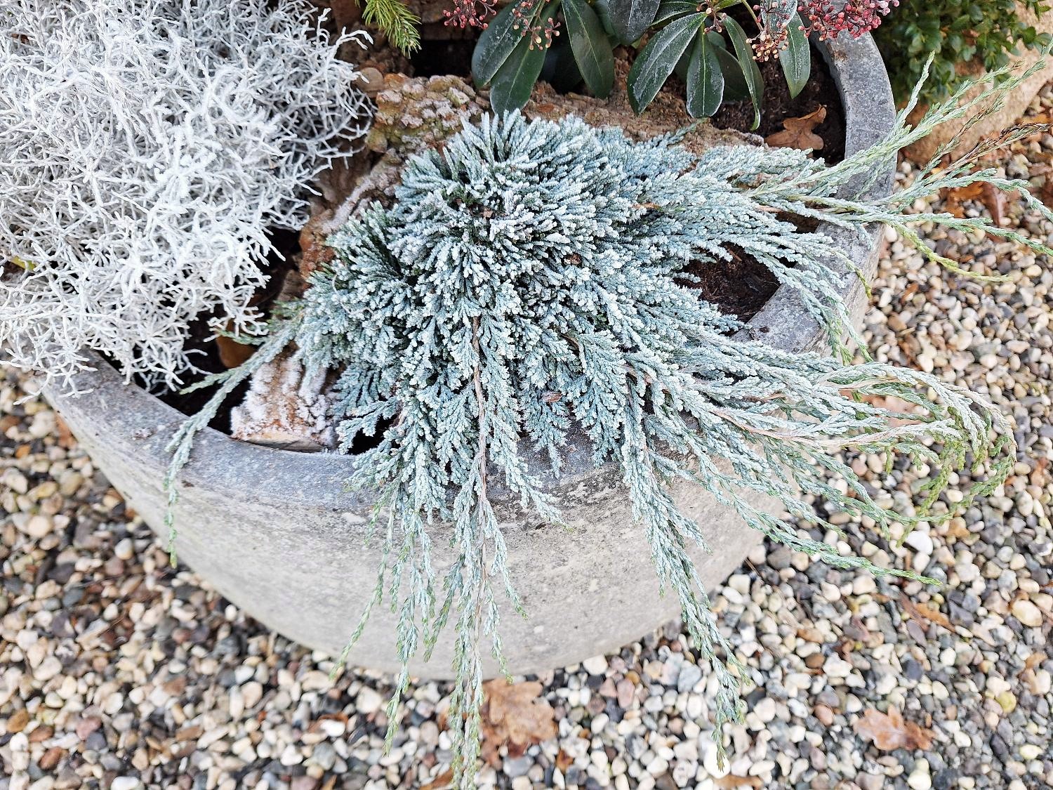 Så det, jeg egentlig ville sige om vinterkrukkerne? Jo, vælg planter, der tåler frost med værdighed. Også selvom frosten ikke varer så længe ad gangen.