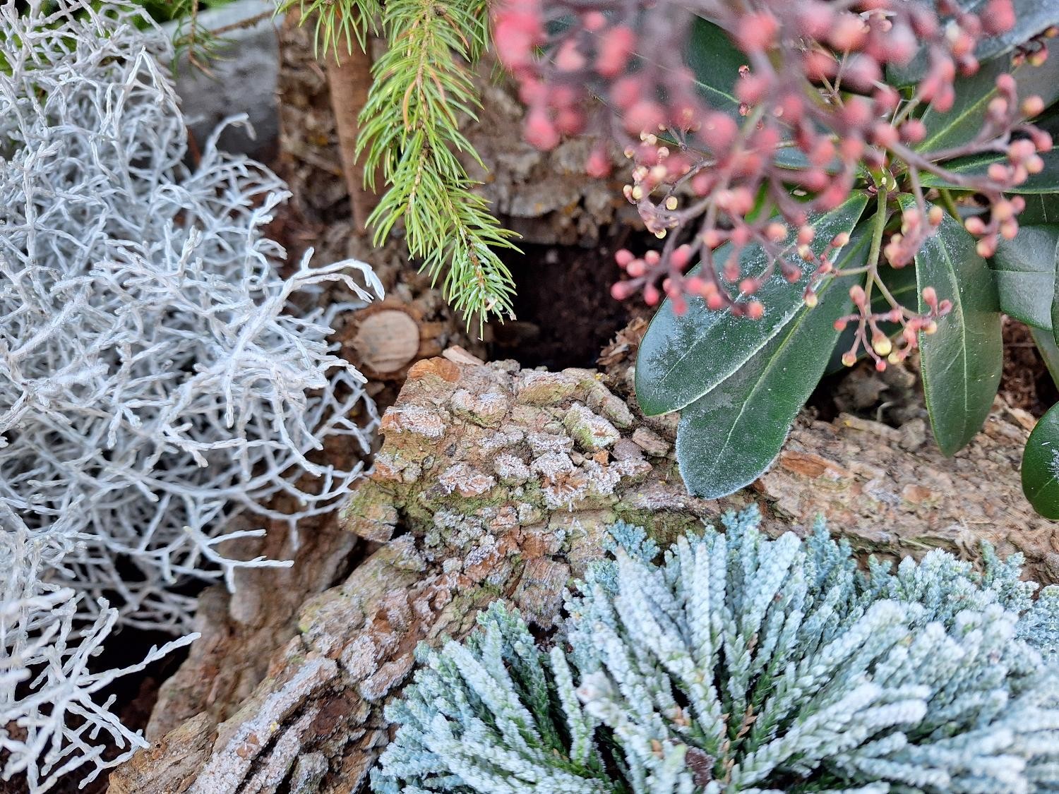 Den kæmpestore krukke ved indkørslen har en lille sukkertopgran, en vindheks, en skimmia og en lille fladt voksende stedsegrøn af en slags. Den er særligt køn med rim på.
