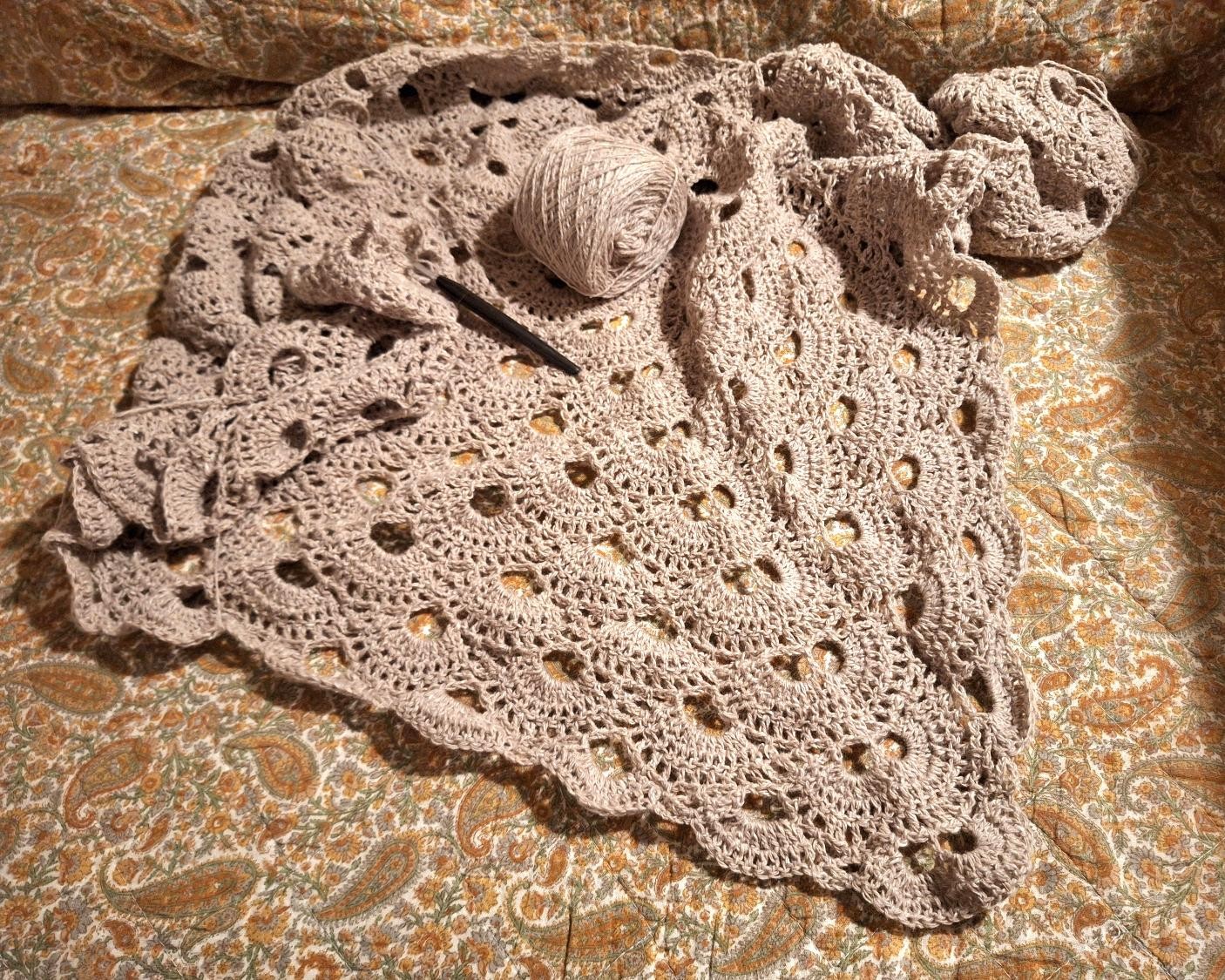 I en køn neutral farve, der lader mønstret spille hovedrollen. Mønstret har jeg prøvet før. Jeg turde dårligt nævne navnet under corona, for det hedder faktisk ‘virussjalet’. Fordi mønsterenhederne spreder sig udfra en enkelt lille cirkel og spreder sig som ringe i vandet.