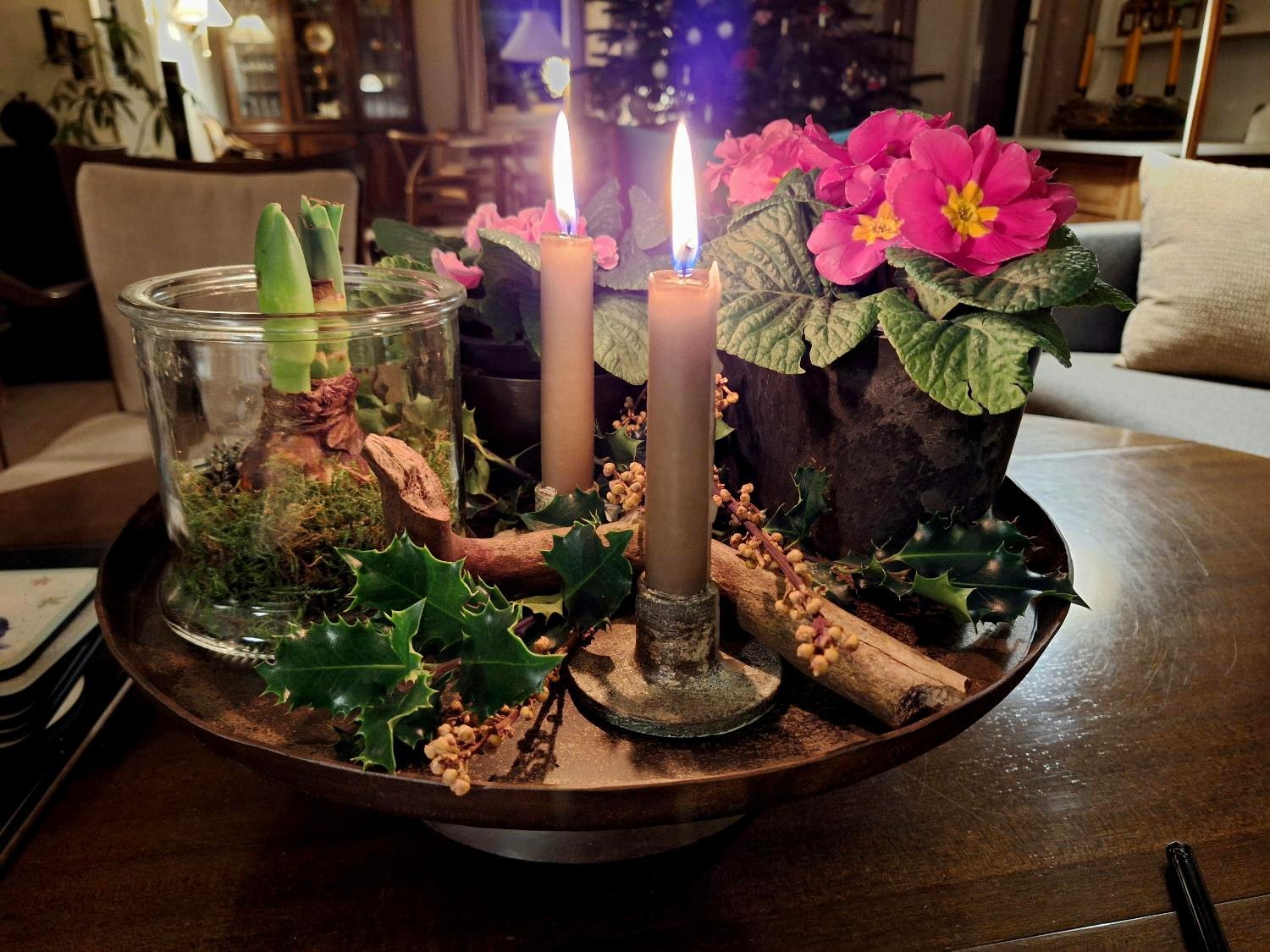 Og så er det tid til ny vinterpynt. For ingen årstid uden pynt. De første primula, røde grene fra haven, en kroget og spændende gren. Vinterstagerne og fyrfadslys.