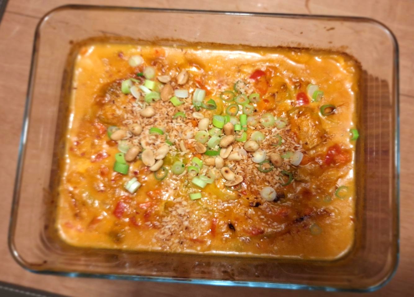 Skulle du nu have mere lyst til kylling i rød karry, gør du det samme med grøntsagerne, men steger kyllingestykker med i gryden, før du hælder kokosmælken på. Den ret skal ikke i ovnen, men er det fisk, er det nemmere at tilberede den i ovnen, så den ikke går i stykker.