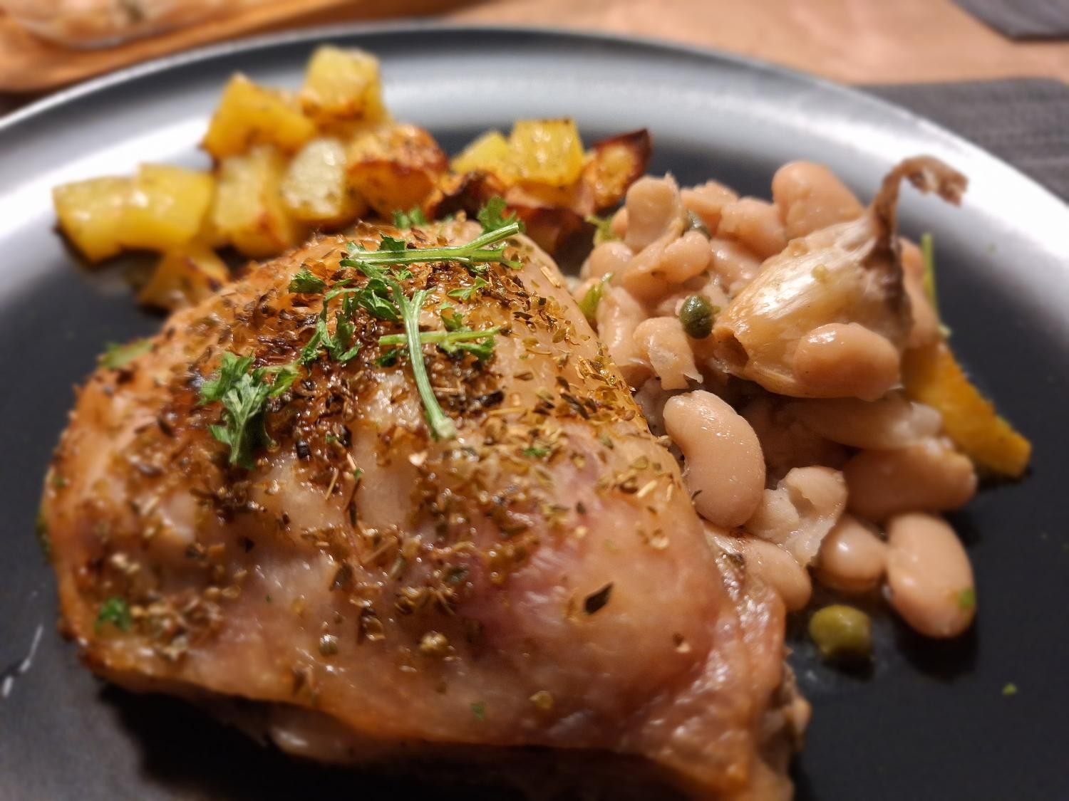 Endnu en opskrift til ‘den sædvanlige’ pakke overlår. Tit på tilbud og tit på bordet. Kylling kan jo varieres i det uendelige, så det aldrig er den samme ret, man laver. Den her gang kylling i fad er med hvide bønner, citron, hele hvidløgsfed, kapers og oregano. Nærmest lidt græsk i smagen.