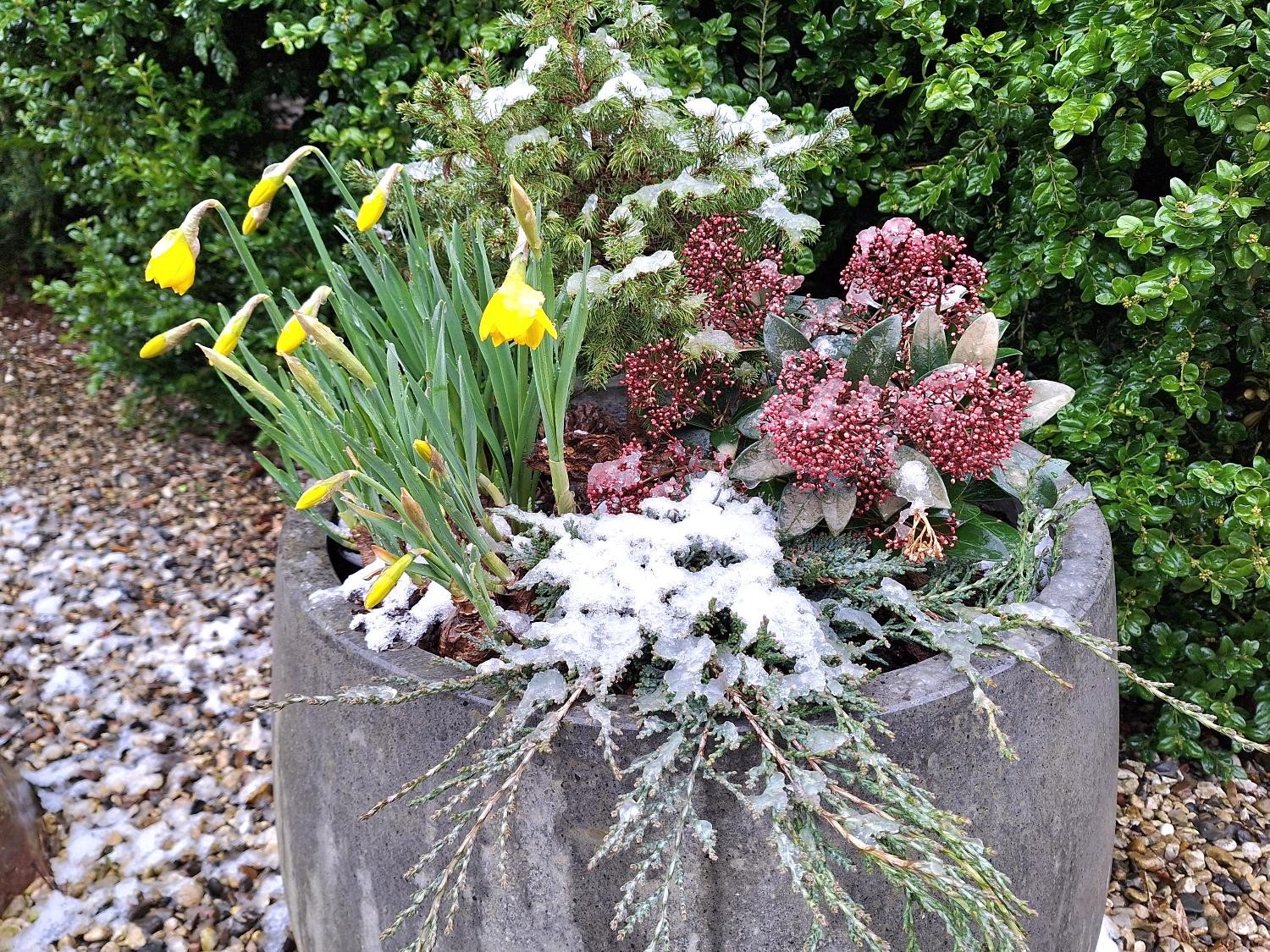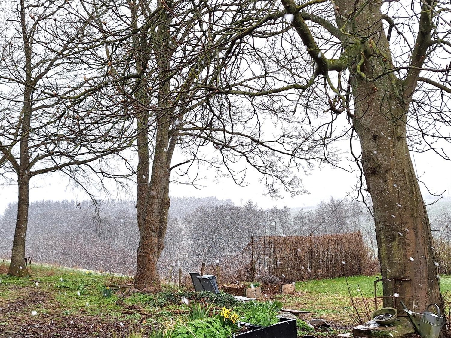 Sne og piskende regn, små forårsblomster, der bøjer sig under vægten af sne og vakler på tynde stængler for den hårde vind. Sådan er det i dag.