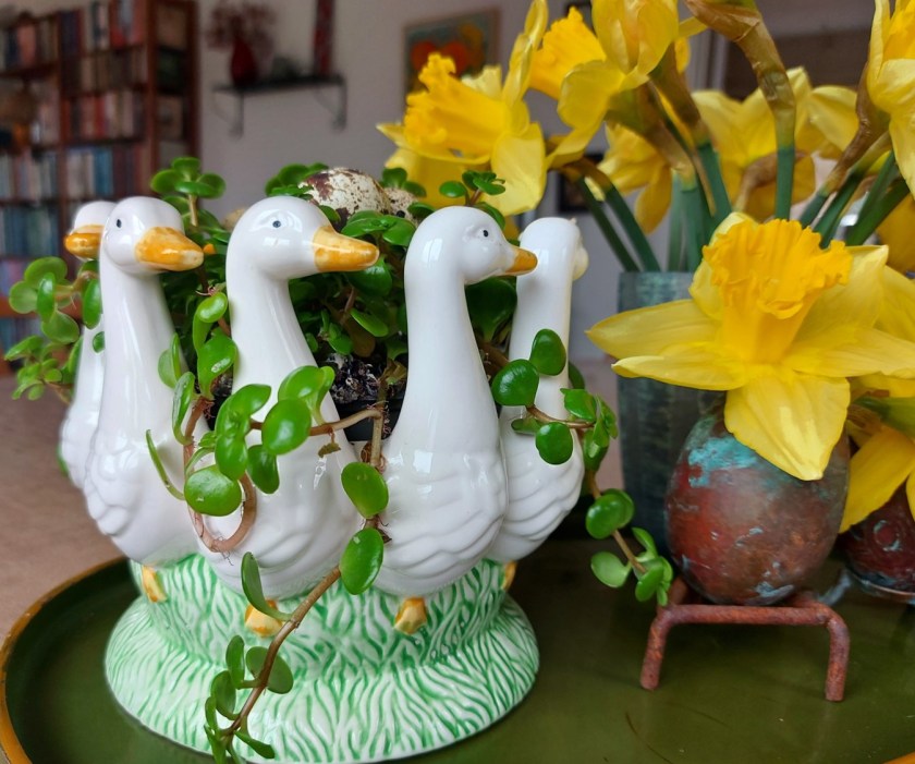 Det griber om sig det med påskepynten. Der er virkelig plads til mange påskeblomster selv i et hus, der ikke er større end vores. Hvor der er hjerterum, er der husrum, som man siger.
