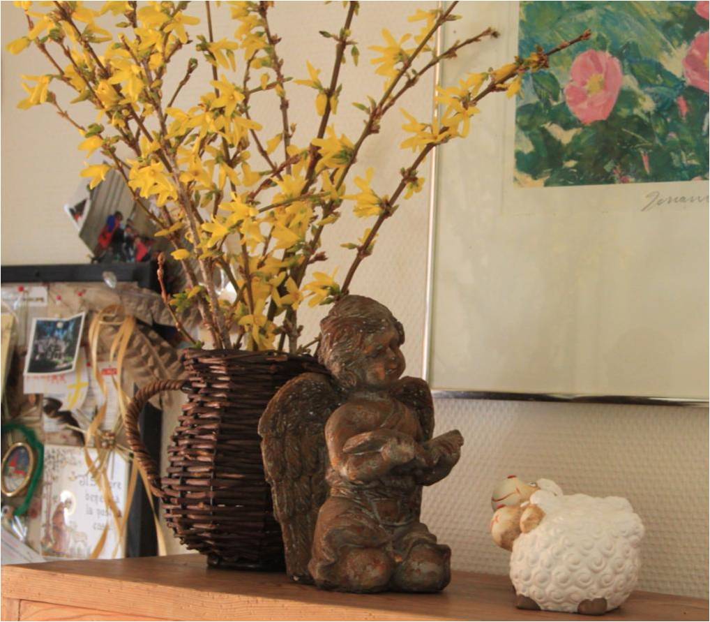 Sig ikke, at det er kedeligt at bo på landet. Her til morgen, meget tidligt, blev jeg vækket af en fnisen fra køkkenet. Jeg listede stille ned ad trappen, og da jeg kiggede rundt om trappen, så jeg en engel, der sad i skyggen af de blomstrende forsythia og læste højt for to påskelam. Ja, det er ganske vist.