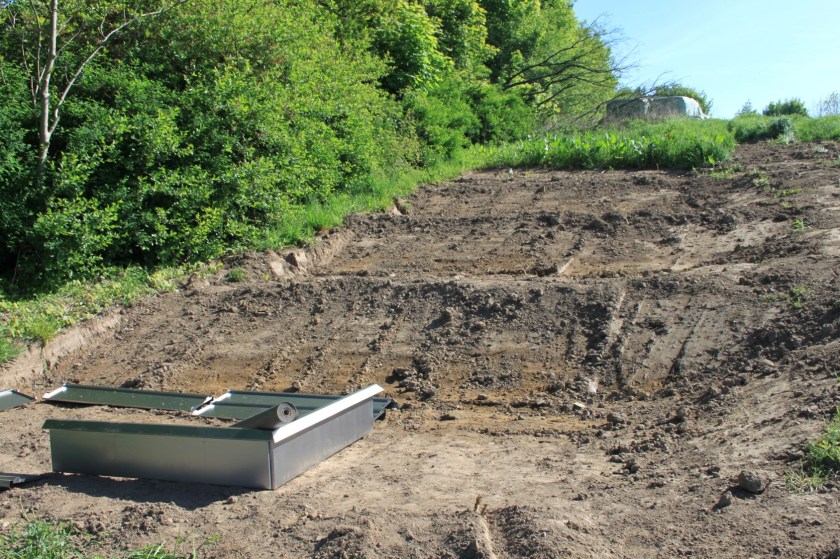 Der er ikke ét sted på vores grund, der er rigtig fladt. Er det fladt, er det, fordi der er gravet ud til det. Det kræver lidt snilde, fantasi – og masser af praktisk hjælp fra folk med store maskiner, hvis vi skal bruge flad jord.