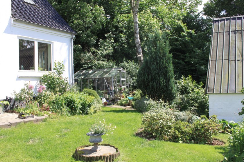 Vores drivhus står beskyttet i læ af skrænten og de høje træer. Det er gammelt. Mindst 20 år gammelt, for det var langt fra nyt, da vi kom hertil i 2003. Det har holdt til orkaner og storme uden ulykker. Det er et rigtig godt drivhus.