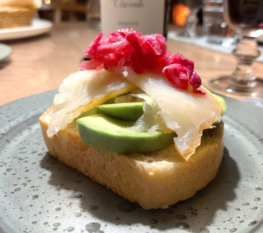 Jeg kiggede på opskrifter på nettet, og faldt for en opskrift, hvor den røgede torsk skulle serveres på ristet brød – som crostini – med avokado og lynsyltet grønt.