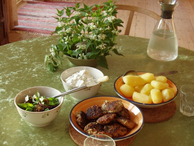 Hvis man får rester af sådan en grillet steg, er kødet tit lidt hårdt i skorpen dagen efter, lidt uspiseligt, med mindre man har hundetænder. Hunden nikkede ivrigt til det, men resterne skulle nu mestendels i menneskemaver. Vi lavede krydrede kødboller af de knap 150 gram kød, der var tilbage, når fedt og sener var fjernet, og det kan godt anbefales.