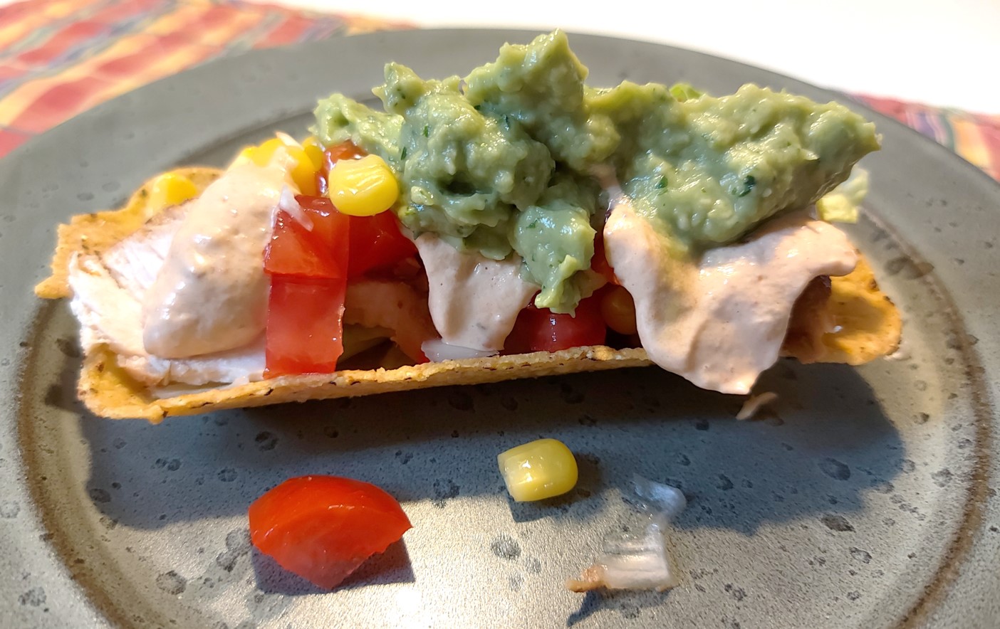 Sprøde taco tubs, sprød salat, marineret og stegt kyllingebryst, Colorado Kates friske majssalsa, en mild guacamole og en hot, hot chipotle dressing.