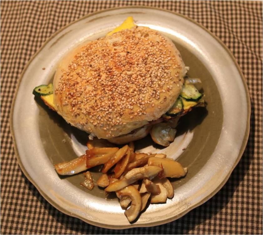 Læg stykker af omelet i en bolle – her en hjemmebagt, blød burgerbolle – og guf så løs. Det er rigtig god frokostmad til at nyde ude – på Restaurant Flimmerskyggen, Cafe den lille Terrasse, Femøren eller et andet godt sted i haven, hvor vind- og solforhold passer.