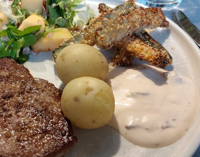 Svampene var friske, lækre markchampignon, vi fandt i engen – i tide, inden ormene tog dem, eller køerne trådte på dem. De skal bare svitses i smør med lidt hvidløg i skiver som en ekstra delikatesse.
