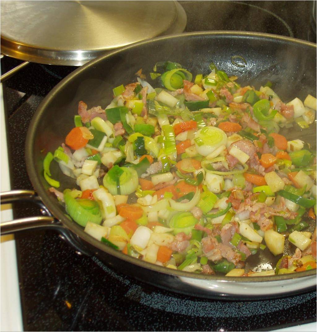 Rens og hak alle grøntsagerne groft. Også den meget oversete grøntsag, bacon. Steg baconternene og steg grøntsagerne med, når der er smeltet lidt fedt af baconen.