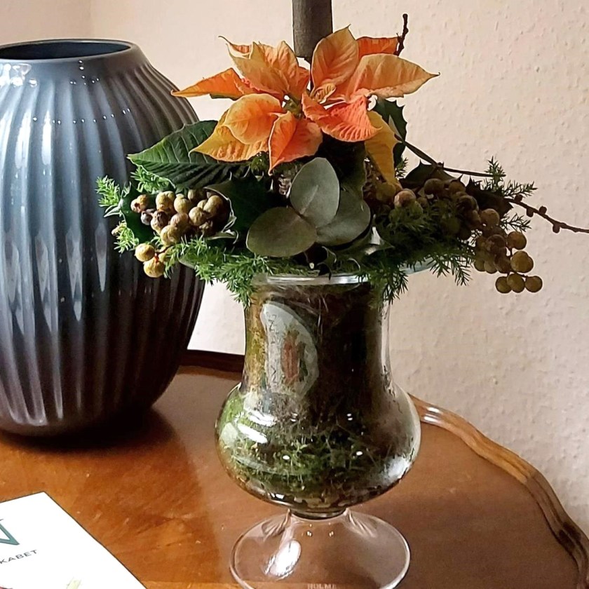 Klik ind og få vejledning til en dekoration, du hurtigt selv kan lave, hvor lys og blomst kan skiftes ud, mens det grønne er stukket i grøn oasis og kan holde sig frisk i ugevis.