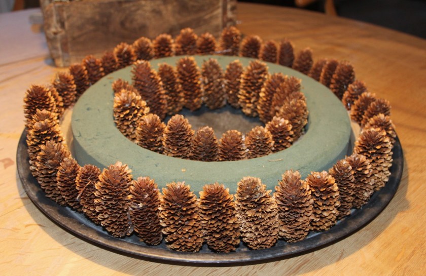 Sidste år lavede jeg en adventskrans med kogler limet hele vejen omkring en oasiskrans – en af dem, der ligesom ligger i en skål.