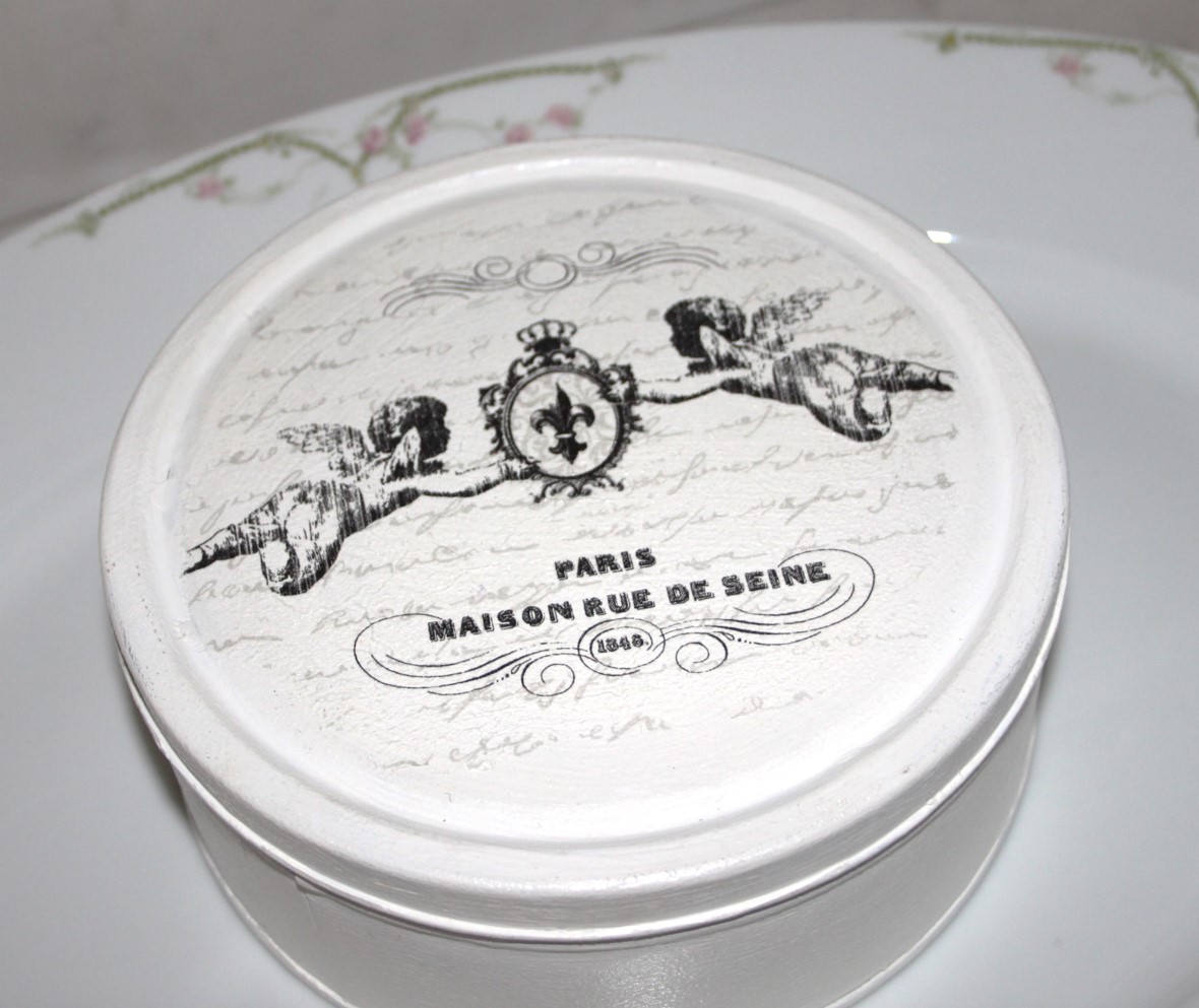 I kælderen stod der to kagedåser, jeg har brugt som ‘reservedåser’. De var fra færdigkøbte småkager, og de var alt andet end kønne. Nu er de kommet til ære og værdighed efter en omgang kalkmaling og decoupage.
