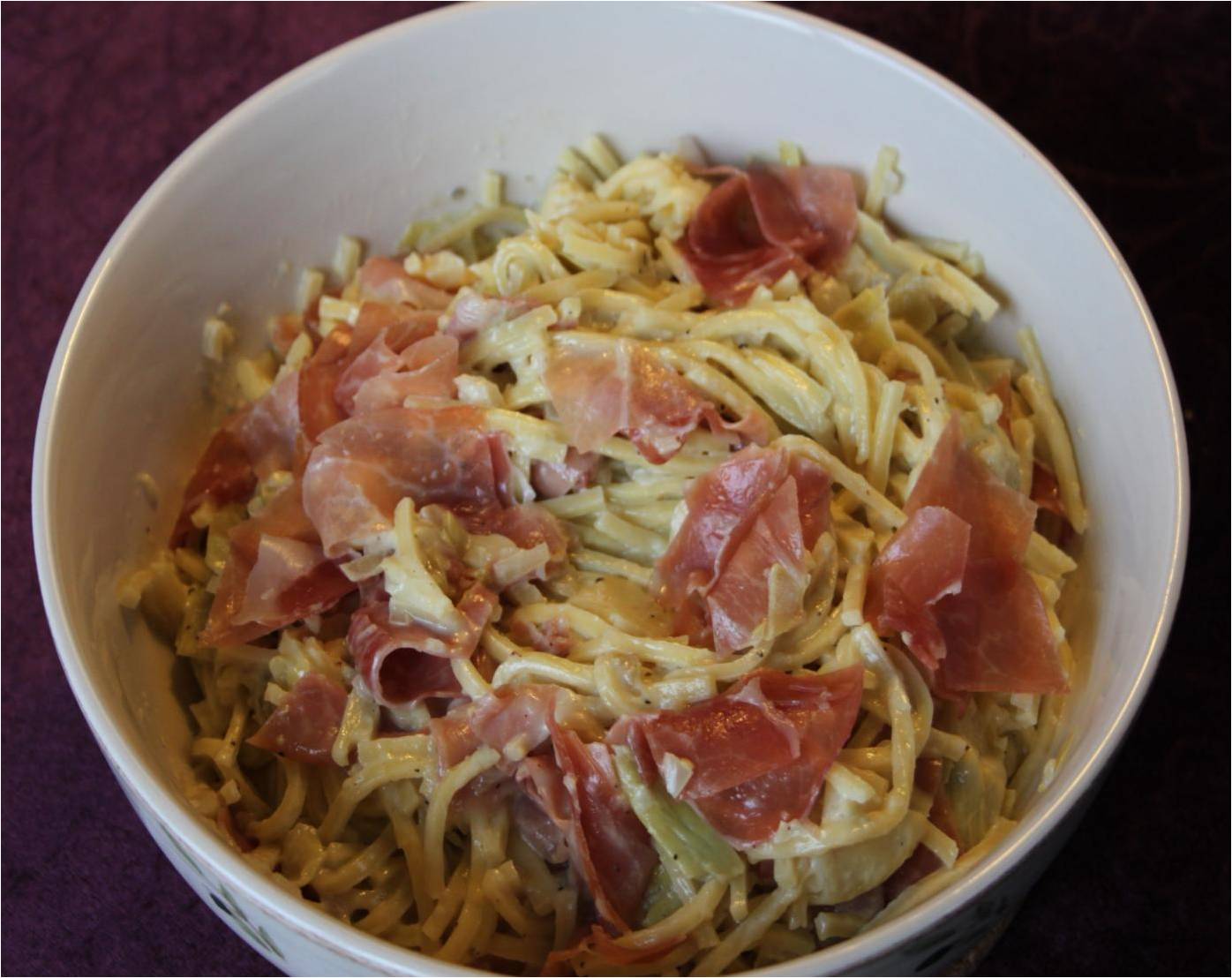 Pasta med italiensk skinke, artiskokhjerter og citronfløde