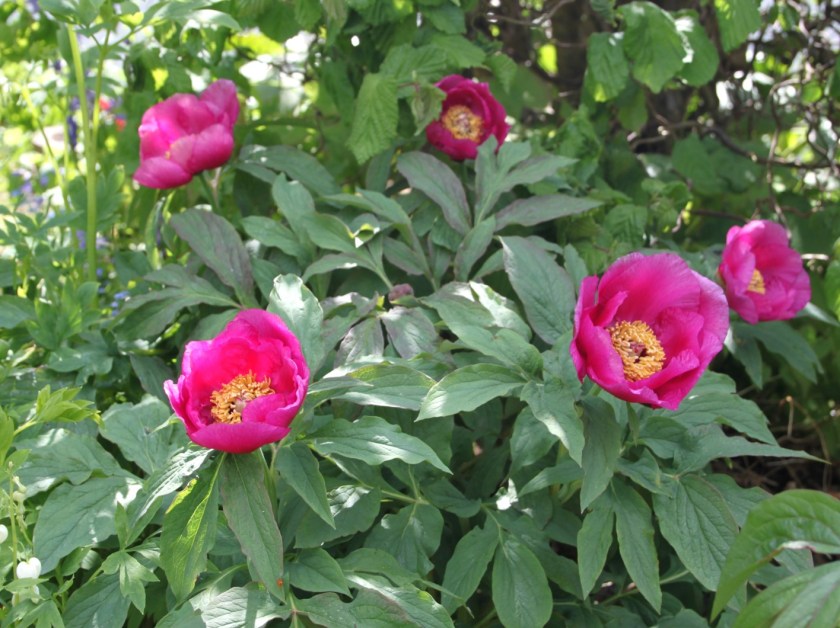 Mælkebøtterne er allerede ved at afblomstre – det var da i går, marken var helt gul af dem, var det ikke? Til gengæld er bonderoserne i haven ved at springe ud. Først den her, jeg fik en knold af for mange år siden. Den er efterhånden blevet stor.