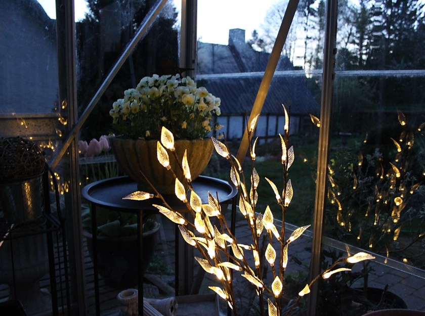 Også i drivhuset var der lys. Der står en solcellelampe af en slags, jeg ikke havde set før sidste år. Grene med små pærer i bladene. Den giver et hyggeligt lys om aftenen, og lysene spejler sig i drivhusets ruder.