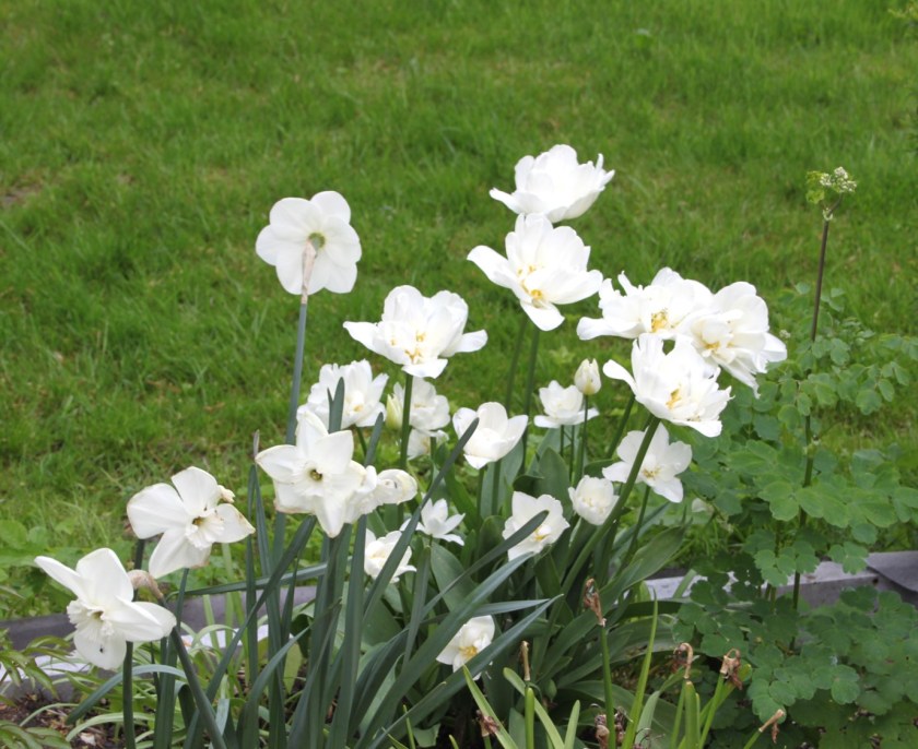Også de hvide tulipaner, som jeg længe gik og ventede på, er fuldt udsprungne. Snart overtager noget andet også der.