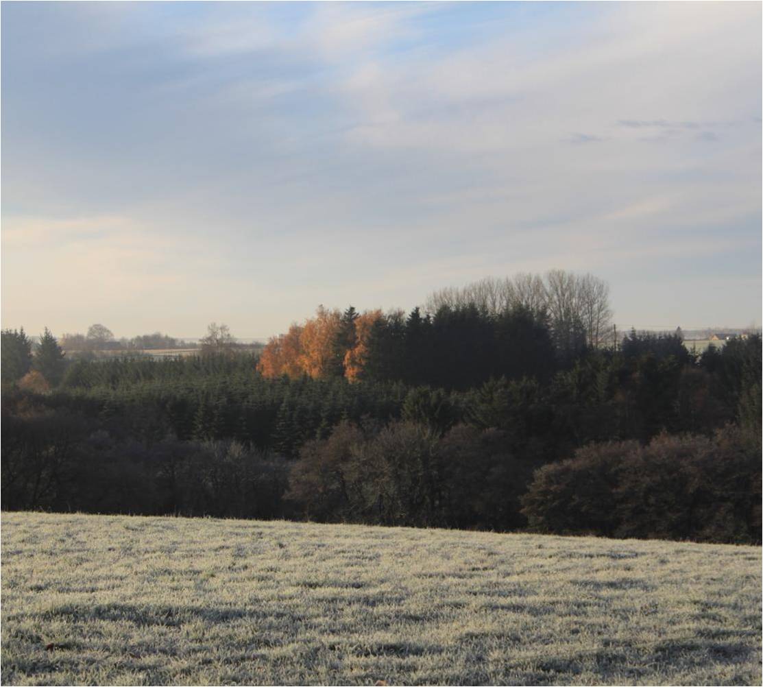 Rigtig koldt, knasende koldt. Rim under støvlerne. Den første rigtige frostmorgen i efteråret.