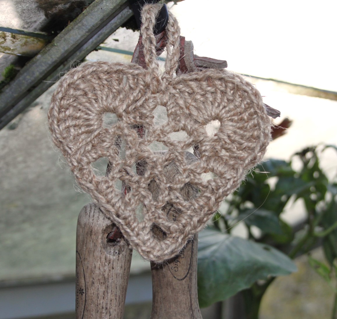 Der er dukket lidt julepynt op inde i drivhuset. Hjerter hæklet af havesnor.