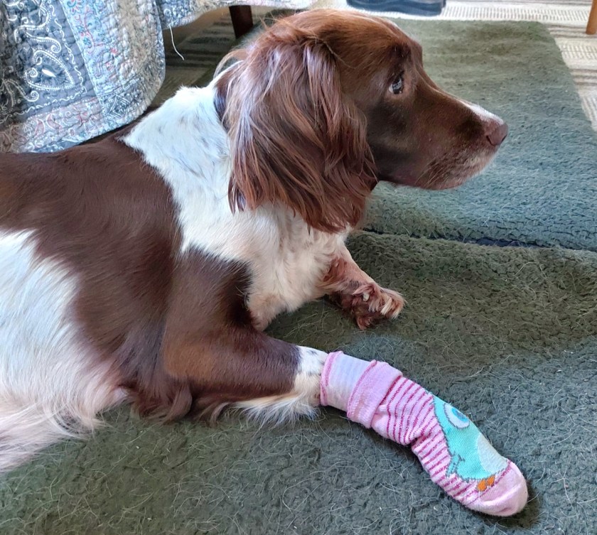 Rosie har slået poten. Hun har på en eller anden måde fået revet en af sine trædepuder næsten af, mens hun var ude og løbe, og det gjorde ondt. Dyrlægen ordnede det, og han gav hende en sok på, så hun ikke kommer til at slikke i såret.
