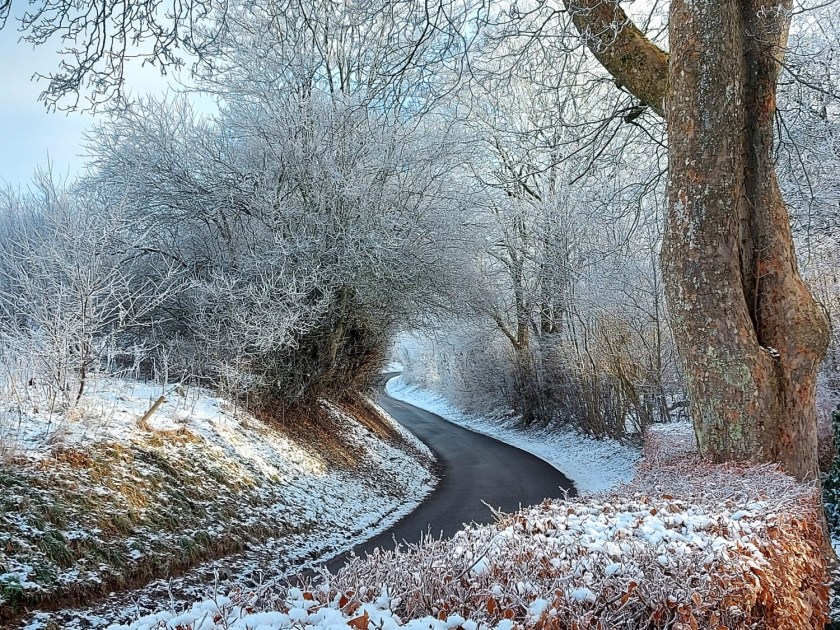 I går var det virkelig smukt derude med rimfrost og sol. Men i dag – i dag er det da lige før, man får hjertestop af al den hvide skønhed. Tyk, tyk rim dækker hver en kvist og gren, og temperaturen holder sig omkring minus 5.