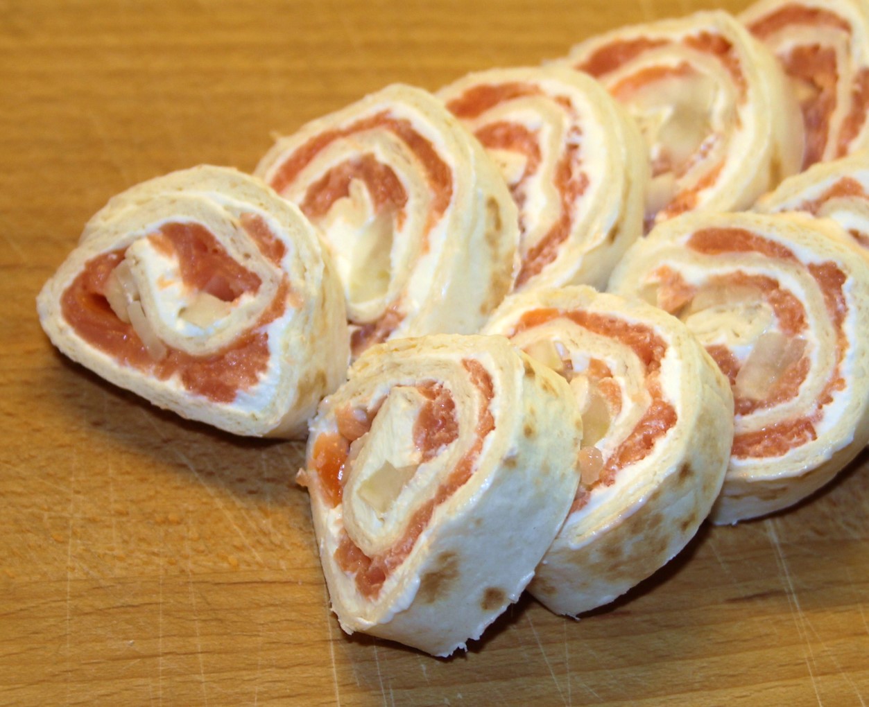 Smør to tortillaer med blandingen, læg laksestykker på (lakserester er glimrende – de fine skiver kan man gemme til en flot laksemad) og rul dem stramt. Pak rullerne ind i film og læg dem på køl i mindst en time. Gerne til dagen efter. Både smag og konsistens har godt af trækketiden.