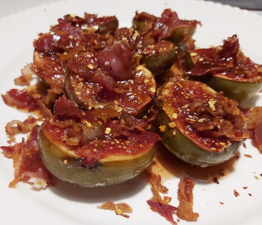 Friske figner med bacon, ahornsirup og chili er noget nær den bedste hapser, jeg nogensinde har smagt. De har det hele. Sødme fra frugt og ahornsirup, syre fra sherryeddike, salt og røg fra sprød bacon – og et lille pift chili fra chiliflagerne, der er drysset ud over hele herligheden.