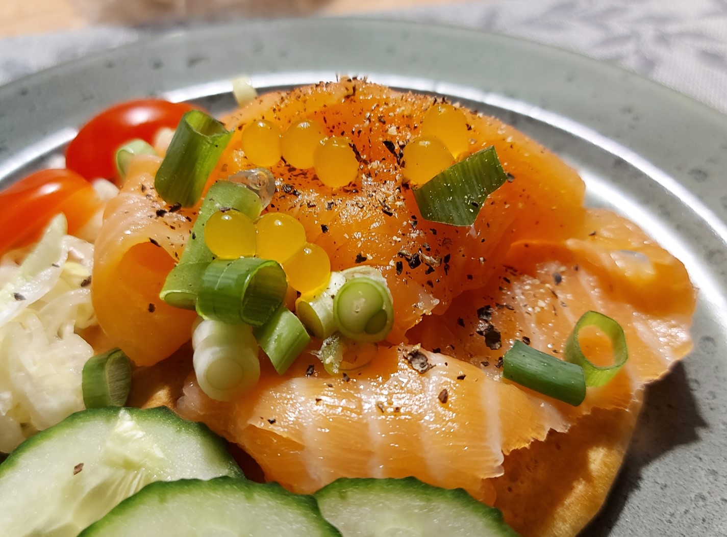 Her er de serveret med røget laks, grønt, et generøst drys friskkværnet peber og nogle af de små, lækre citronperler.