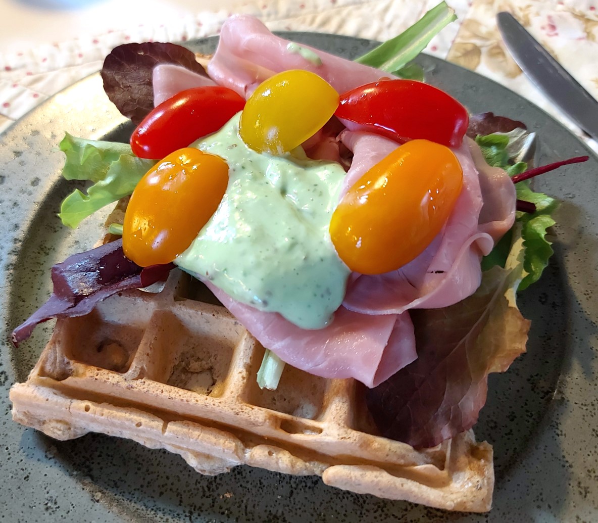 Fortsæt med at læse “Bruschetta 3: Med balsamico tomater”Rugvafler med skinke, grønt og hjemmerørt mayo med basilikum