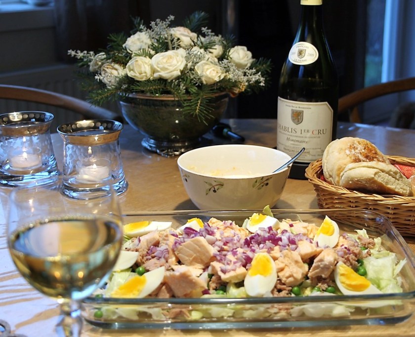 Nytårssalaten med laks og tun er der kommet nogle spørgsmål til, så her kommer opskriften. Den er lavet af, hvad vi nu havde i fryser, køleskab og skab, så der er faktisk ikke nogen særlig plan bag.