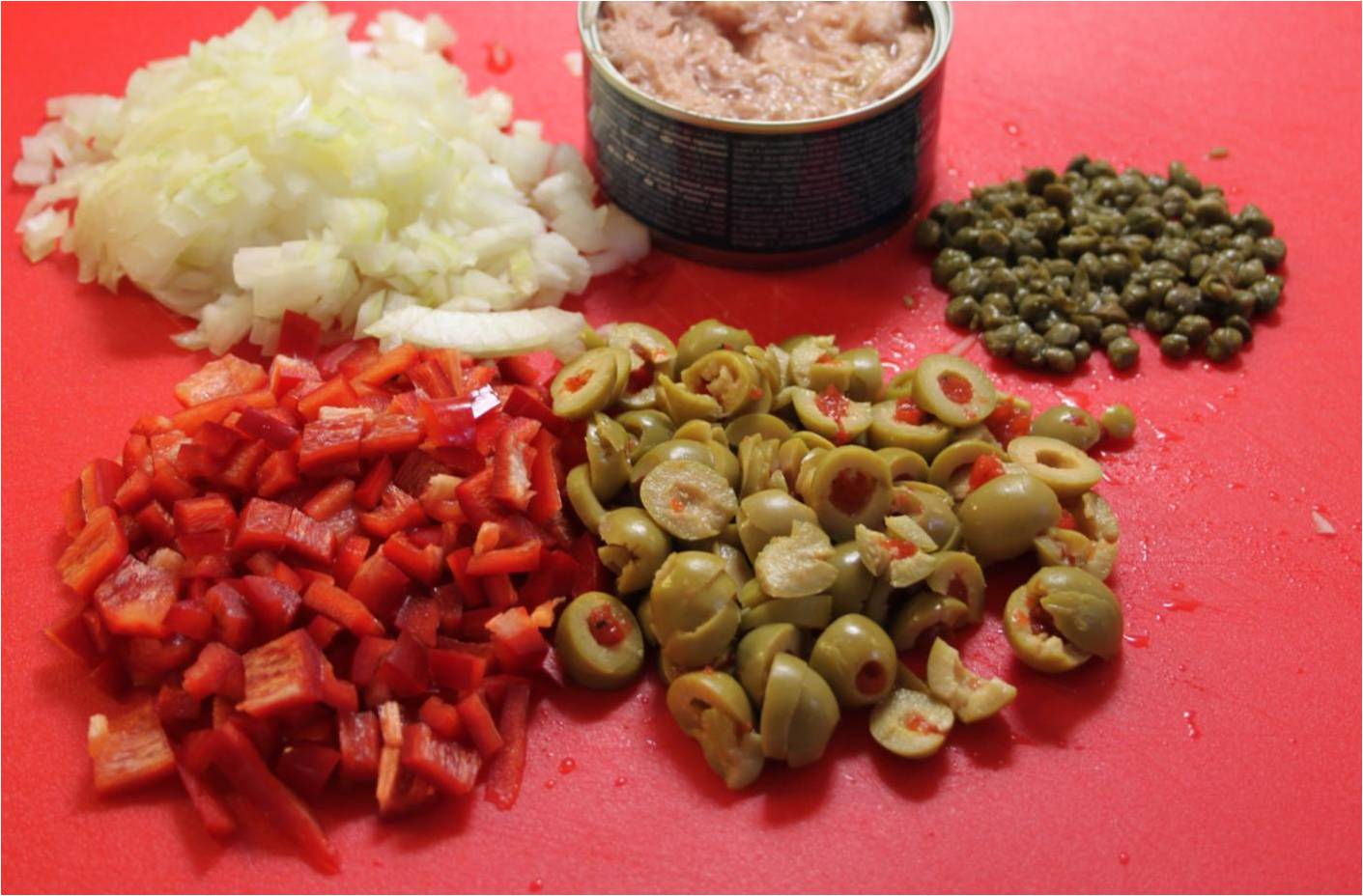 Sauter det hakkede løg, til det bliver blødt og klart, tilsæt tun, peberfrugt, kapers, oliven og et skud chili, hvis du kan lide det. Hæld vin og vand på og lad det koge igennem. Tilsæt fløden og lad det koge igennem igen – jævn evt. med lidt Maizena. Smag til med salt og peber.
