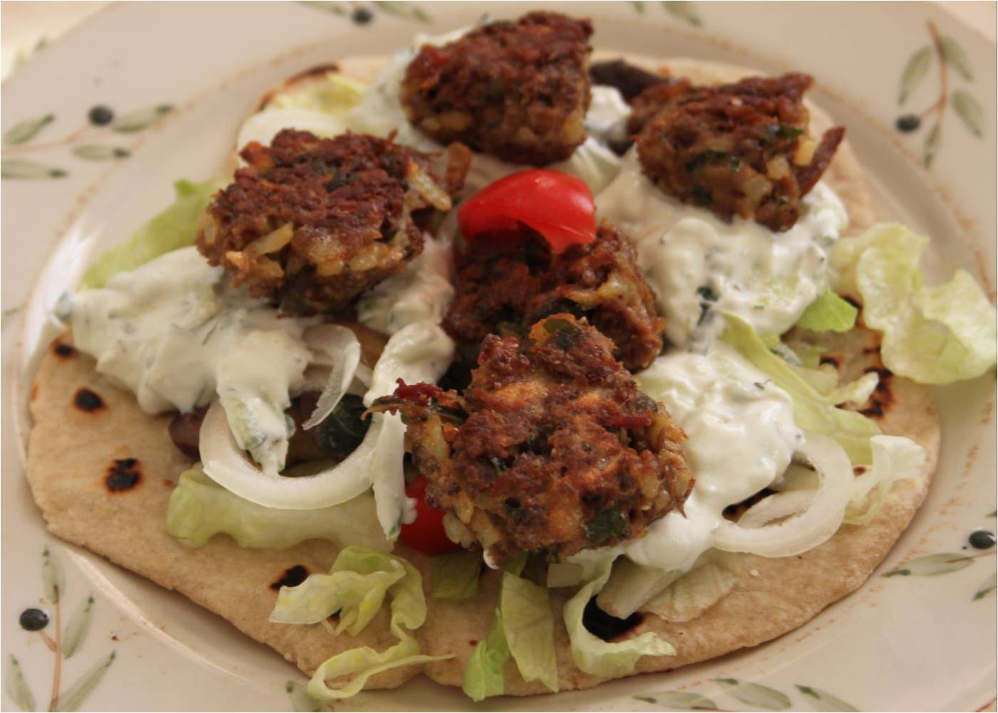Dertil fik vi hjemmelavede wraps, fintsnittet iceberg, tomatbåde, løgringe og resterne af gårsdagens mynte-tzatziki.