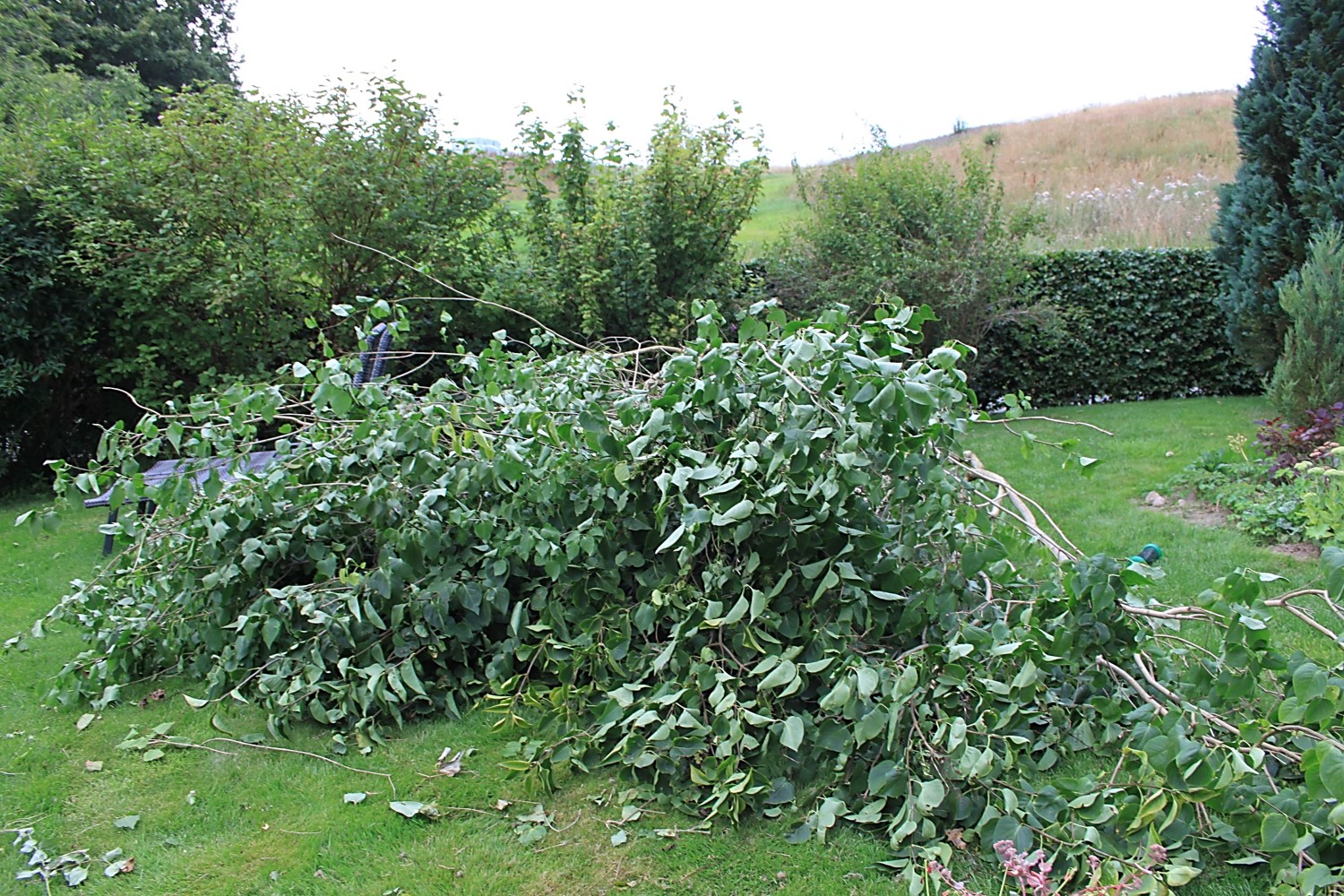 Syrenen i haven, der var ved at blive for stor allerede sidste år – og året før, hvis jeg skal være helt ærlig, har nu fået dødsstødet. Det var lidt med sorg, fordi den var det første tegn på have, vi fik i byggerodet dengang. Men… helt ærligt… den var blevet kolossal, og den skyggede for udsigten fra den lave terrasse. Den skyggede også for planterne i bedet ved siden af.